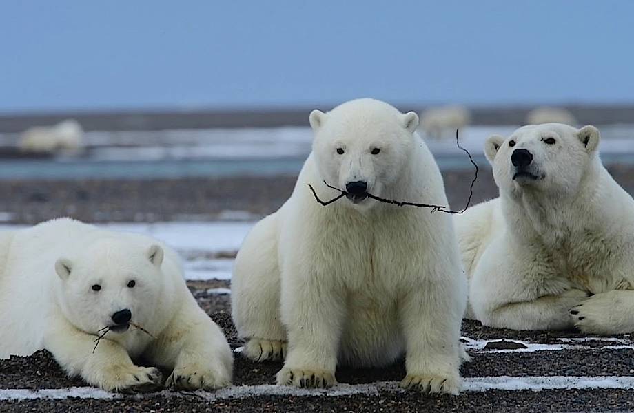 Исторически известны случаи дружеских отношений белых мохнатых великанов не только со своими сородичами, но и с другими видами животных. Несмотря на одинокий жизненный путь, белых медведей часто можно увидеть в компании, играющими между собой. Наиболее игривы молодые особи, особенно в брачный период. Таким образом полярные хищники учатся конкурентной борьбе за самку. На кадрах представленного ниже видео можно увидеть, как косолапые развлекаются, кидая в воду ветки.
