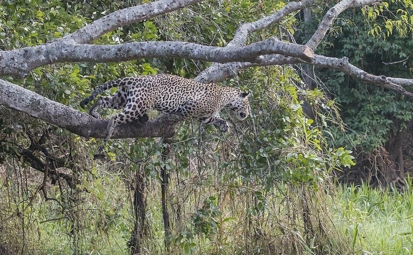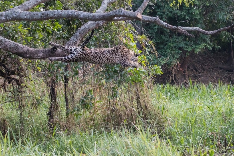 Дикая кошка вышла победителем и с легкостью утащила огромную добычу к себе на дерево. Вообще, ягуары — это единственные представители кошачьих, кто охотится на крокодилов и питается ими.