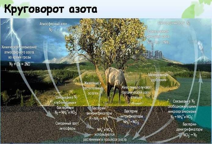 Источником азота в атмосфере являются не только промышленные предприятия, но и органические остатки, те самые, что, например, образуются в результате опадения листьев. Органические азотные соединения преобразуются в результате жизнедеятельности бактерий и почвенных микроорганизмов в чистый азот, который и поступает в атмосферу. В результате реакции с кислородом образуется оксид азота. Так в упрощенном варианте выглядит классическая схема биологической циркуляции азота.