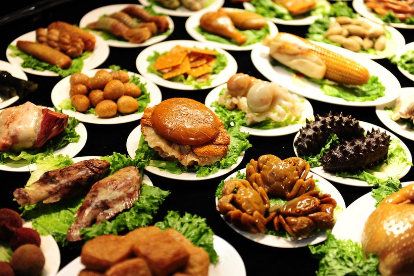 Первая партия блюд включала в себя супы из свиных сухожилий и морских огурцов, крабов и акульих плавников, а также ламинарий и свиного рыльца. Вторая партия состояла из тушеной медвежьей лапы, карповых языков, губ гориллы, фаршированных рисом, верблюжьего горба, приготовленного на пару. Кроме того, были поданы супы из поросячьего мозга, черепах с мягким панцирем и шелкопряда. Последняя партия мясных блюд включала в себя жареную обезьяну, молочного поросенка с рисовой кашей и фаршированного голубя. Венчал это все десерт из фруктов.