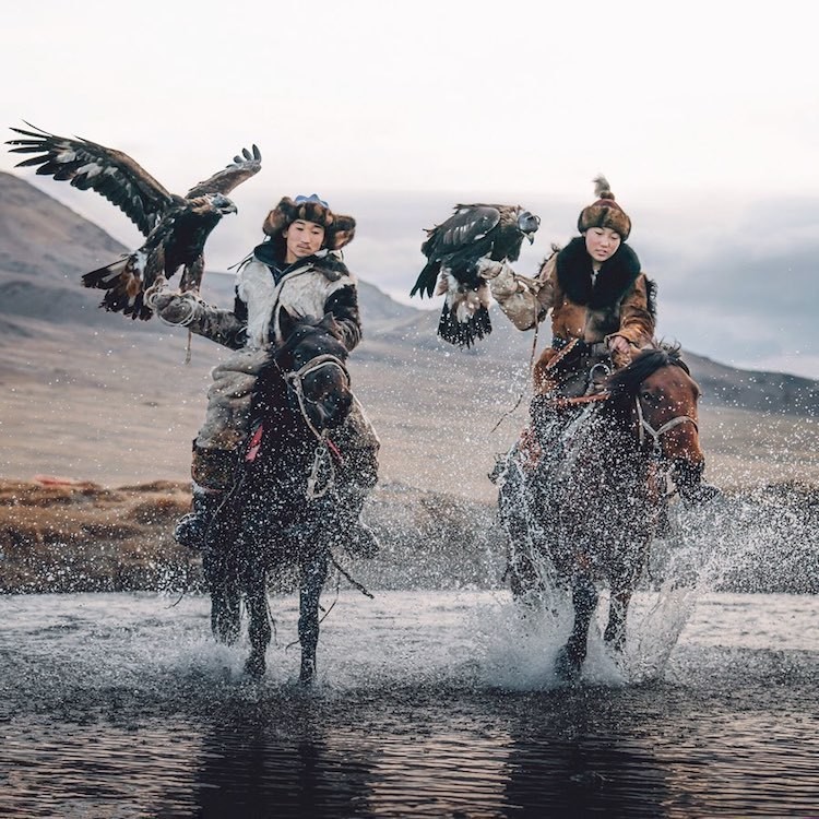 На сегодняшний день осталось около трех сотен хранителей этой традиции, владеющих соколами. Подавляющее большинство из них мужчины. Во время поездки в эти отдаленные места у Томаса была возможность познакомиться с Заманбол, одной из десяти монгольских охотниц. Она — член казахской кочевой семьи и проводит большую часть своих дней, посещая школу в городе. На выходных она тренируется с соколом вместе со своим братом Барзабаем. Фотографии Томаса демонстрируют Заманбол верхом на лошади в одежде из меха, сделанной руками ее родственников. Каждый снимок отражает силу ее свободного духа и неразрывную связь с ее пернатым партнером.