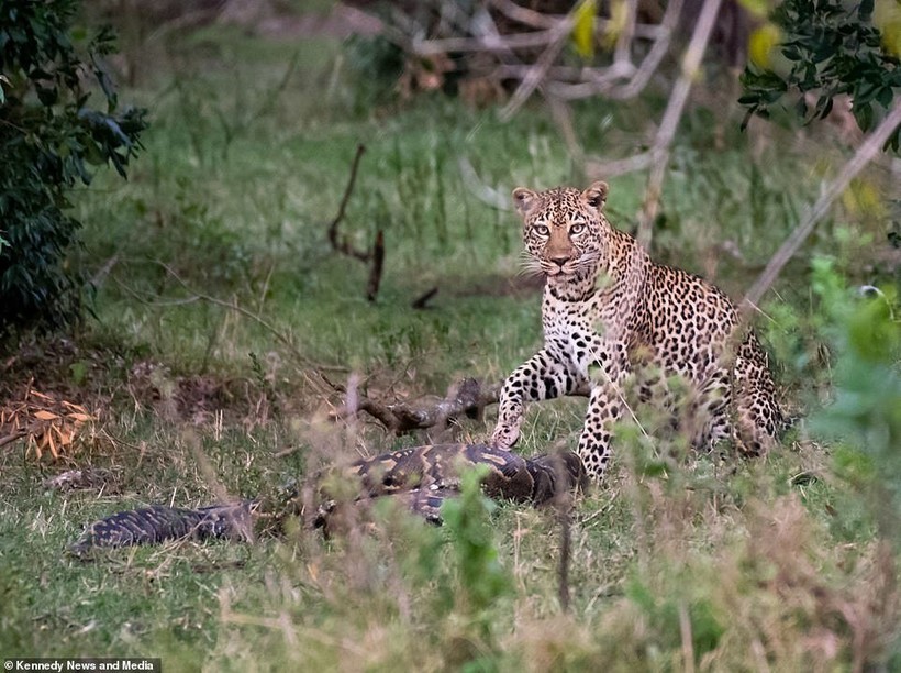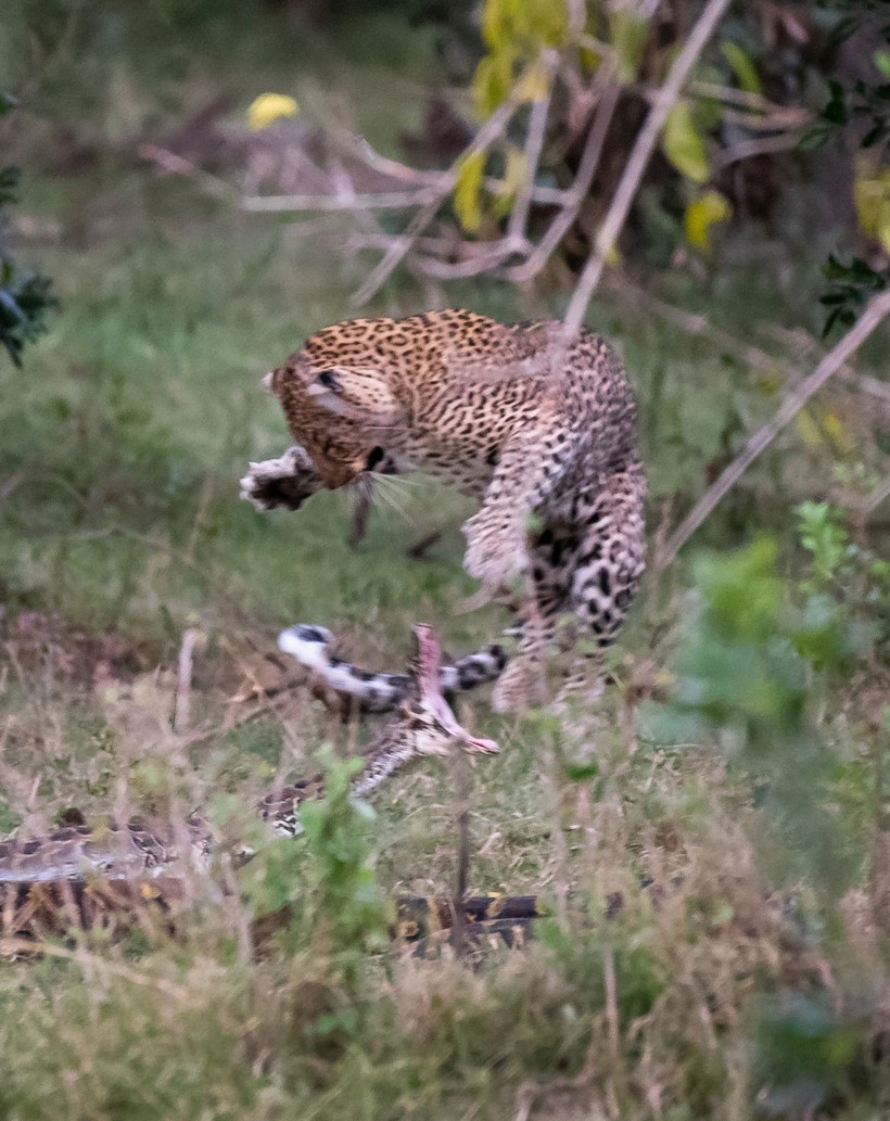 В заповеднике внимание леопарда привлек проползавший мимо скальный питон. Питоны — неядовитые змеи, и хищники знают об этом, поэтому иногда могут охотиться на него. Леопарда не испугали довольно большие размеры рептилии: скальные питоны являются одними из четырех самых больших змей на Земле. Одна особь может весить до ста килограммов. Но кошке не привыкать — ее добыча часто весит больше нее самой в два, а то и три раза. Питон мог бы охотиться на леопарда, но этот хищник из семейства кошачьих слишком проворен для рептилии, которая поглощает добычу живьем, удушая ее своими мощными кольцами. Для питона в случае такой охоты самое главное — отбиться от противника.