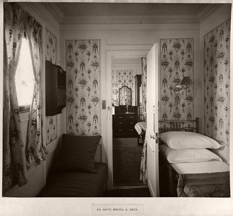 «Мавритания» была образцовым лайнером эдвардианской эпохи, невероятно роскошная и изысканная. Так выглядели номера с ванной комнатой.