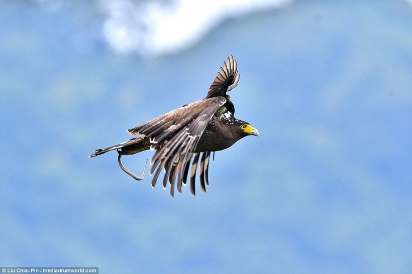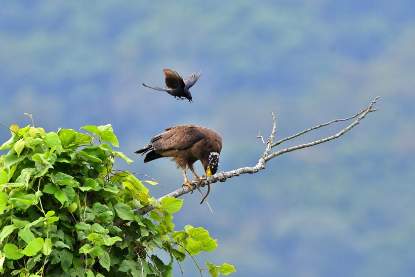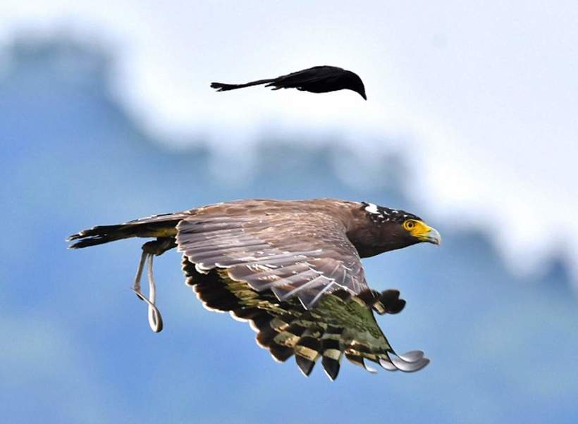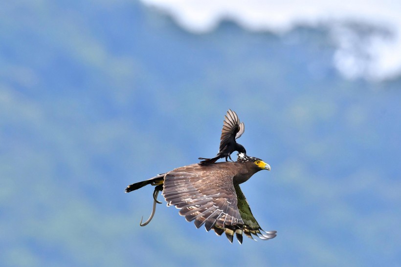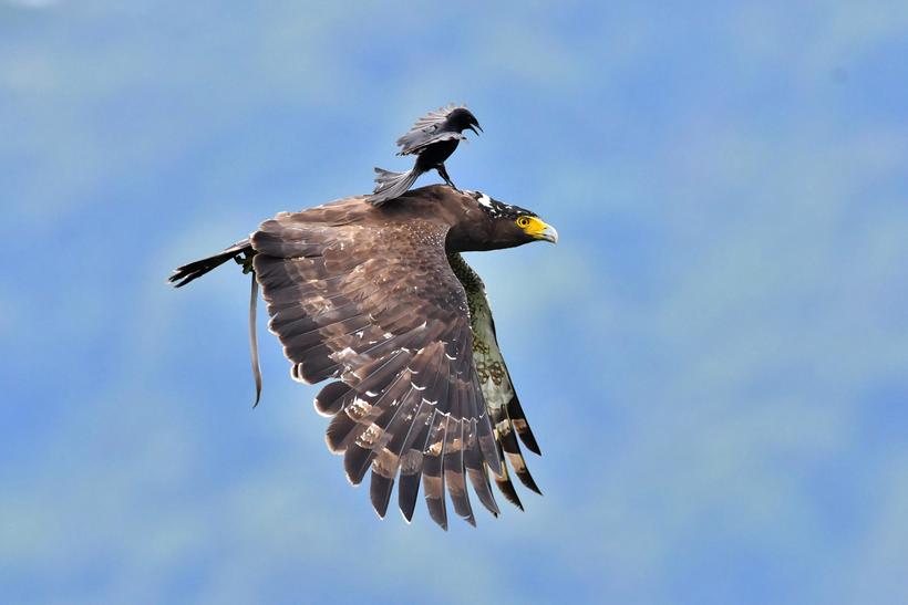 Большая хищная птица вынуждена была подняться в воздух вместе с добычей, чтоб отделаться от надоедливого дронго.