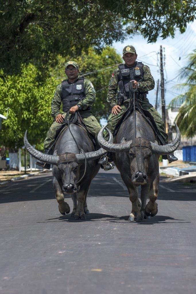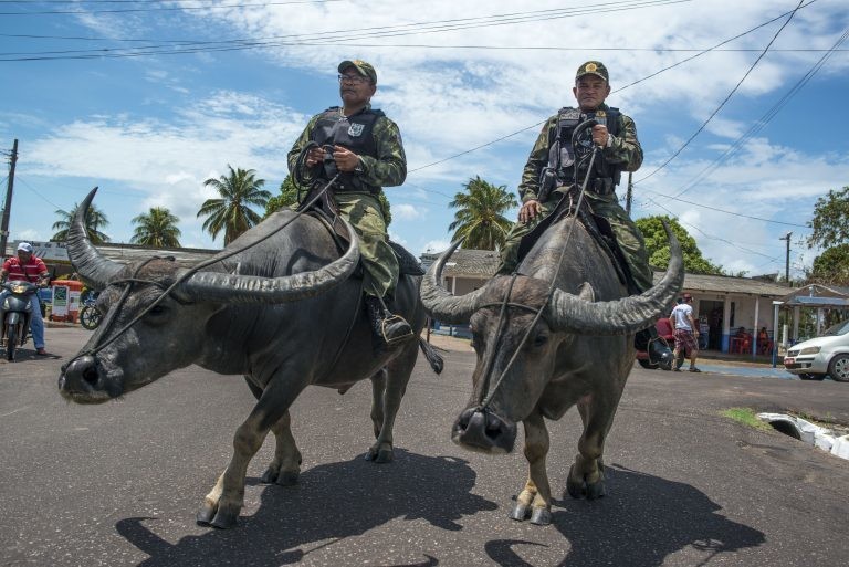 Чаще всего полицейские сегодня передвигаются на автомобилях, реже ― на мотоциклах. В некоторых странах существует конная полиция, а вот на бразильском острове Маражо полицейский патруль ездит верхом… на буйволах! Недавно на острове побывал фотограф Фернандо Камара и привез оттуда удивительные снимки.
