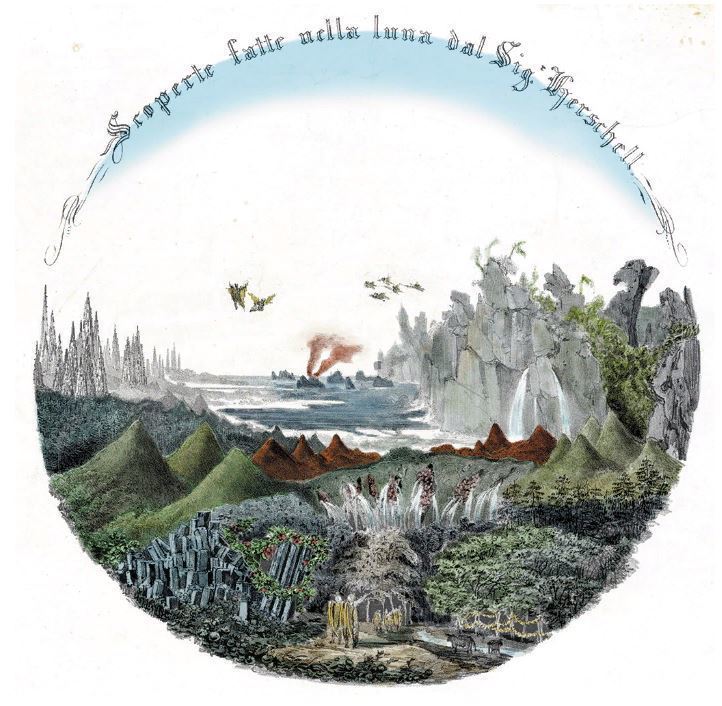 Гигантские летучие мыши-люди, сутки на пролет уплетающие фрукты и радостно болтающие между собой; козлоподобные создания с синей шкурой; собор из полированного сапфира. Именно такие необыкновенные зрелища открылись взору Джона Гершеля, знаменитого английского астронома, когда в 1835 году он направил мощный телескоп на Луну из обсерватории в Южной Африке. Ну или, по крайней мере, так заявляли читателям в газетных репортажах нью-йоркской газеты The Sun.