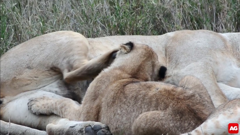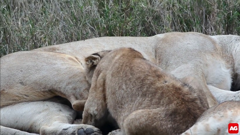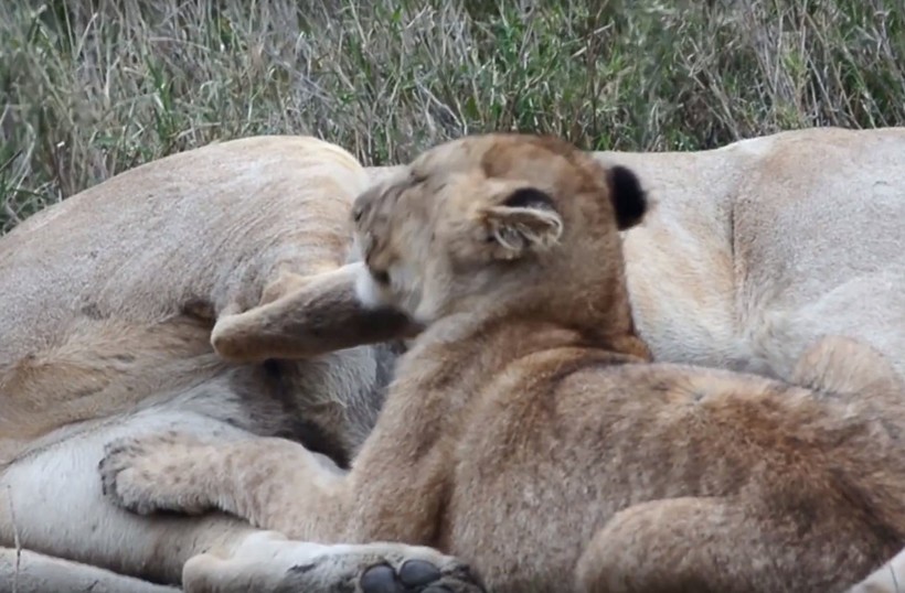 В этом видео уже подросший львенок решает попробовать поесть так же, как и в младенчестве. Но самка показывает ему, что уже поздно питаться подобным образом. Львенок не останавливается и подходит к другой львице, чтобы попытать счастья там. Но и вторая самка показывает ему лапой, что время питаться молоком уже прошло.