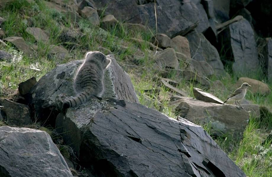 Охотиться этот представитель семейства кошачьих предпочитает ночью или ранним утром. В его меню входят все мелкие грызуны, птицы, насекомые и даже зайцы. Нападает на свою жертву хищник из засады, в которой может таиться долгое время. Его выручает неповторимая внешность, позволяющая сливаться с окружающей средой. Уже в возрасте 3-4 месяцев все малыши манулов выходят на первую охоту. Они постепенно учатся развивать свои навыки и набирают бесценный опыт для выживания в дикой природе. Одного такого маленького пушистого охотника удалось снять автору видео. Котенок, сидя в засаде, собирался напасть на птичку, но внезапно сам попался в лапы своему игривому сородичу.