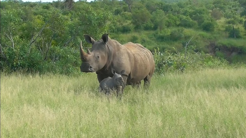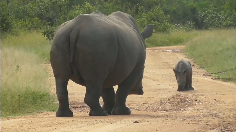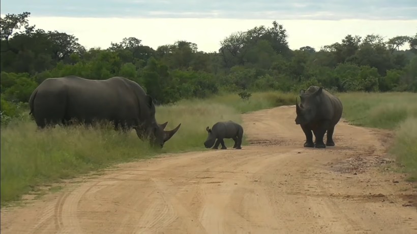 Одними из обитателей заповедника Крюгера являются носороги. Недавно туристу парка удалось снять видео из серии «один день семьи носорогов». Было раннее утро. Малыш-носорог жался к матери. Они стояли у дороги в невысокой траве. На другой стороне стоял отец-носорог, наблюдая за семьей. Мама с детенышем вышла на дорогу, и самец пошел им навстречу. Кроха решил бросить вызов своему отцу и начал наступать на него. Папа-носорог, играя, стал пятиться назад, уводя детеныша за собой.
