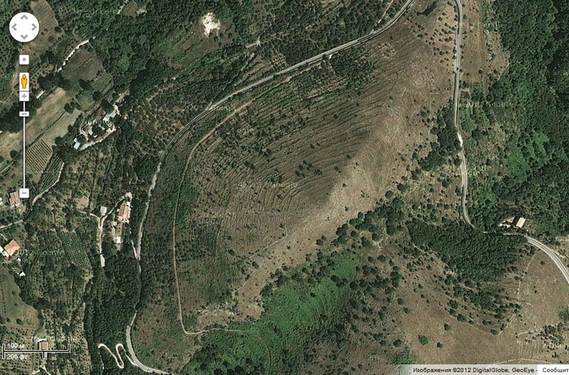 А вот на снимке, сделанном со спутника, холм уже никакого внешнего сходства с пирамидой не имеет.