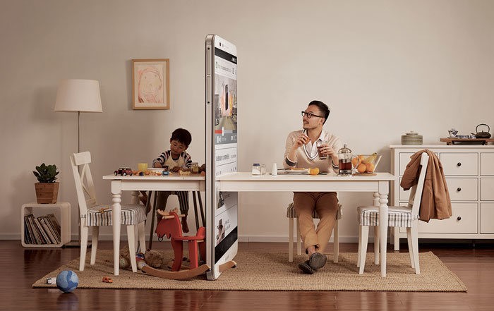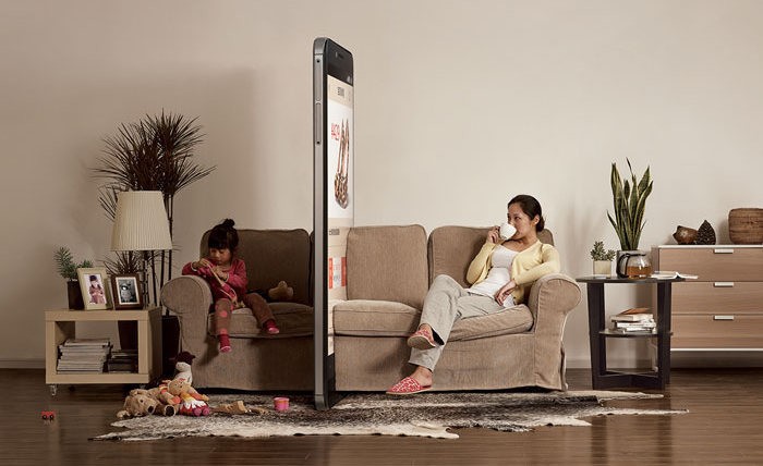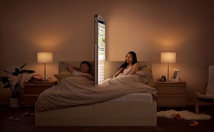 В Китае придумали необычную социальную рекламу: центр психологических исследований выпустил три ролика, в которых семья разделена стеной из смартфонов. На одном папа смотрит видеоролик и не видит, чем занят его сын, на другом маму от дочери отделяет смартфон с рекламой очередных туфель, а на третьем стена между супругами выросла прямо в кровати.