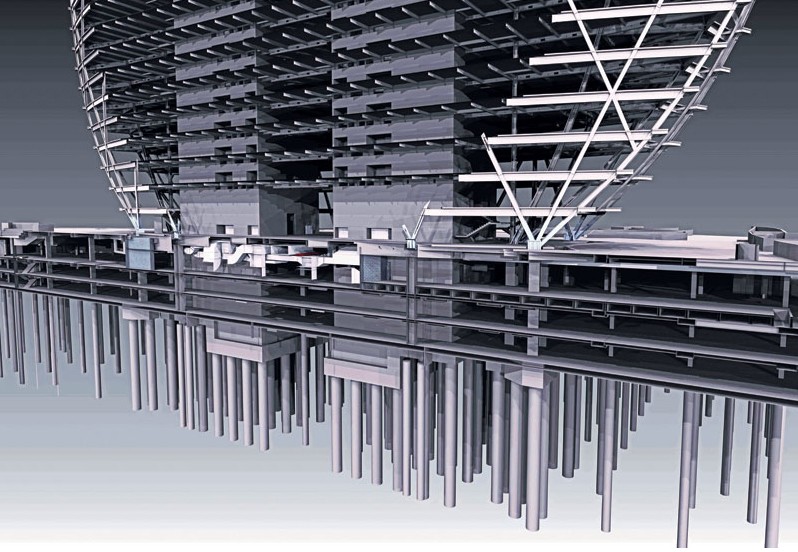 Для того, чтобы вода не просачивалась и не разрушала будущий котлован под фундамент, строителям пришлось соорудить бетонную стену глубиной 16 метров, изолировав место будущей стройки. После этого было вбито около 400 бетонных свай, которые послужили опорой для уникального небоскреба. Сверху на сваи была помещена внушительная бетонная подушка, на которой и шло сооружение самого небоскреба.