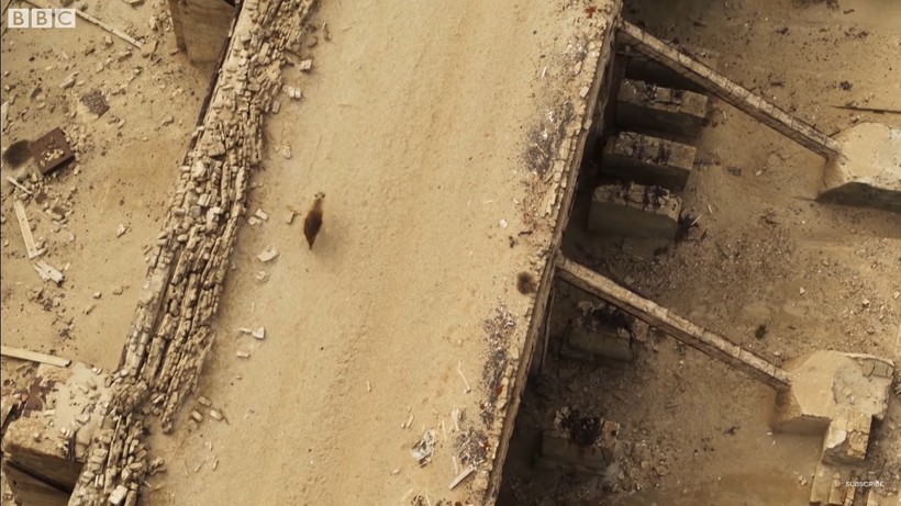 Эти два молодых щенка находятся на новом этапе своей жизни. Им уже четыре месяца, и сейчас они нуждаются в твердой пище. Но в этих руинах нет ничего съестного для них. Поэтому их мать вынуждена отправиться на поиски еды в пустыню, оставив щенков одних на несколько дней или навсегда. Этот вид гиен всегда охотится поодиночке, поэтому велик риск стать жертвой львов или обычных гиен — их природных врагов.
