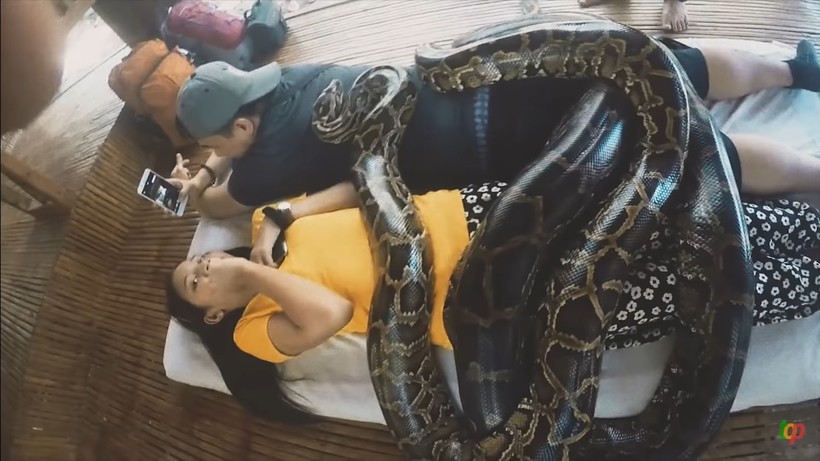 В филиппинском зоопарке предлагают экстремальный массаж питонами. Сеанс продолжается 10-15 минут. Желающие испытать себя ложатся на кровать, затем несколько мужчин достают из ящиков бирманских питонов и укладывают их на человека. Общий вес питонов около 250 килограммов. Питоны медленно ползают по телу человека, что действует успокаивающе.