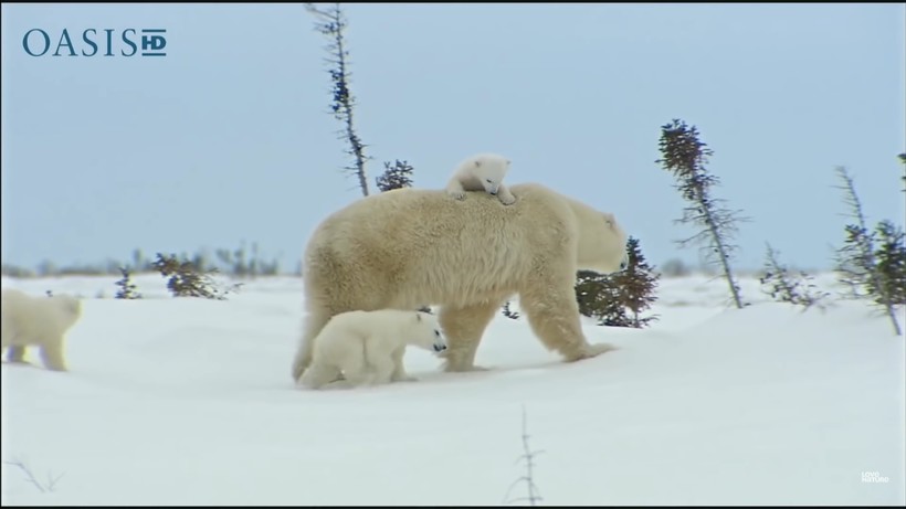 Мама-медведица и трое ее медвежат покидают пещеру. До охотничьего угодья на льдах мм идти еще два дня. Там они смогут найти пропитание в виде рыбы, тюленей и морских котиков. Самый маленький медвежонок слишком слаб для такого путешествия, поэтому он проводит весь поход на спине своей мамы, в то время как старшие и более сильные братья бегут позади. Но хороший вид и легкая поездка на маминой спине имеет свою цену. Иногда это как родео — надо суметь удержаться и не упасть.