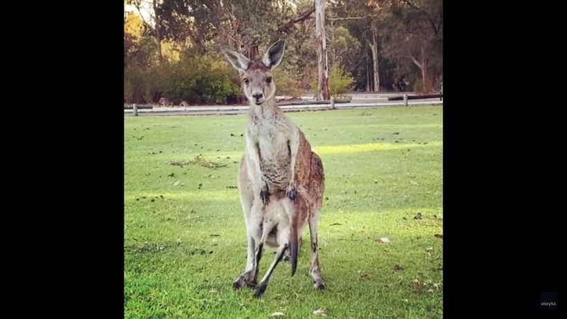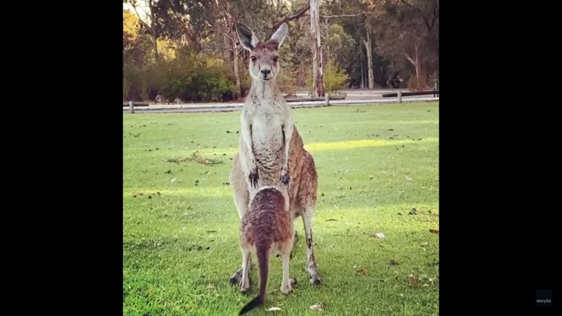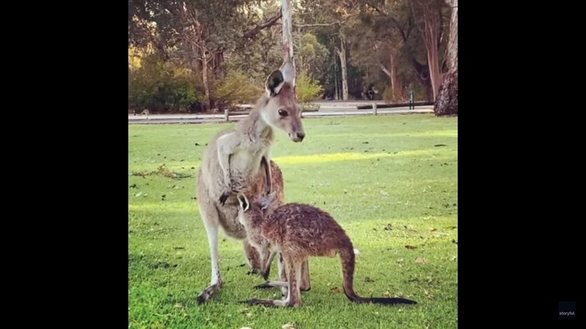 Автор забавного видео шутит, что маме-кенгуру нужна сумка побольше, так как малыш слишком велик для нее. Но кенгуренок пытается залезть в «свое укромное жилище». К сожалению, у него ничего не выходит. Мама-кенгуру не старается помочь детенышу. Она начинает щипать травку, а потом скачет прочь. Малыш следует за ней.