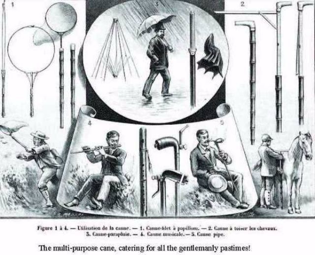 Когда-то джентльмены не выходили из дома без своей трости… Особенно без такой, в которой прекрасно сочетались армейский нож, зонт, сачок для ловли бабочек, флейта, трубка для опиума и измеритель роста лошади. Практически все истинные увлечения настоящего джентльмена в одном.