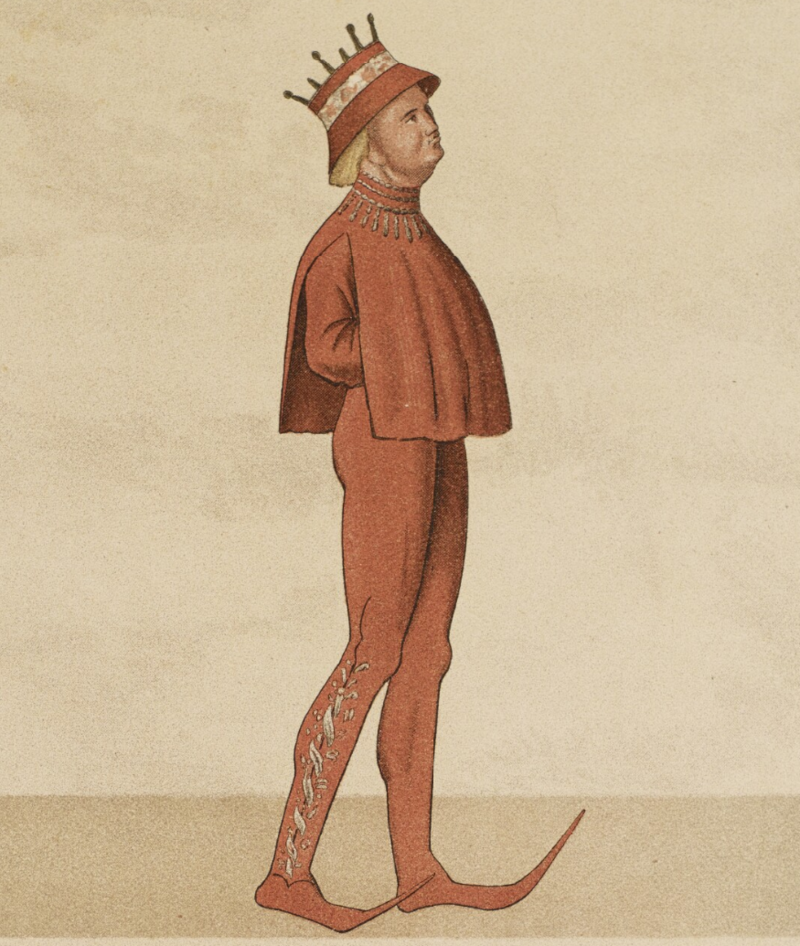Длинноносая обувь с 1200 годов настолько крепко вошла в моду, что в ней щеголяли не только дамы, но и серьезные лорды. Особенно в 15 веке.