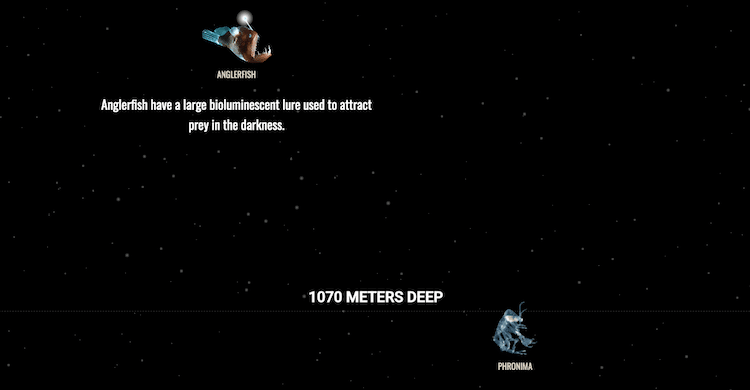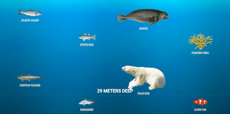 По мере того как посетители сайта «погружаются» на глубину, они знакомятся с различными интересными фактами и цифрами о подводной жизни. Близко к поверхности океана, на глубине до 30 метров, рядом с белым медведем, который, как известно, ныряет на такую глубину, чтобы добыть пищу, можно увидеть знакомых рыб, таких как атлантический лосось и полосатый окунь. Спускаясь глубже, вы увидите косатку на глубине до 100 метров и зеленую морскую черепаху, обитающую под 170-метровой толщей воды. Чем дальше вы будете опускаться в недра Мирового океана, тем более интересная и удивительная информация вас ждет.