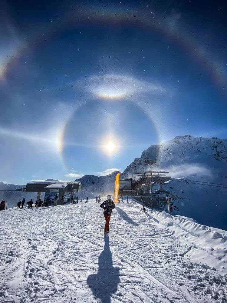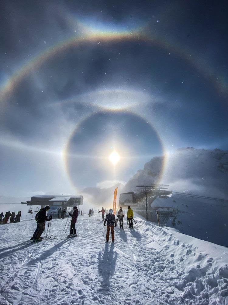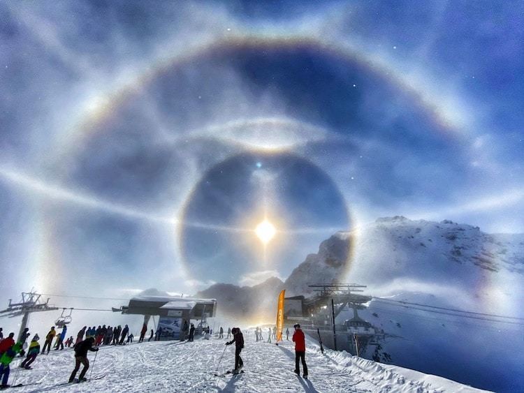Блогер-любитель Майкл Шнайдер отправился в швейцарские Альпы, чтобы провести веселый и яркий отпуск с друзьями, катаясь на лыжах. Но он точно не ожидал сделать фотографию, которая произвела фурор в интернете. Пока Шнайдер ожидал друга на вершине склона, он решил проверить камеру на своем новом смартфоне. Получившиеся снимки, на которых запечатлены поразительные ореолы вокруг солнца, стали вирусными в первые же часы их появления в сети.