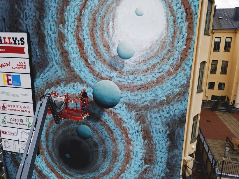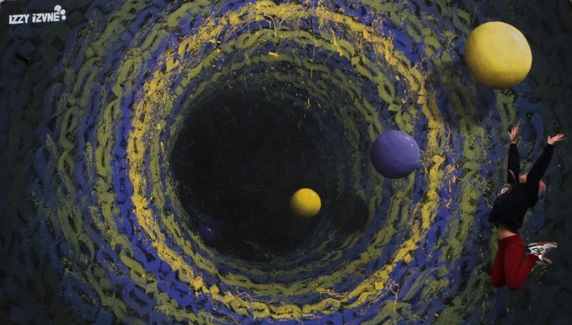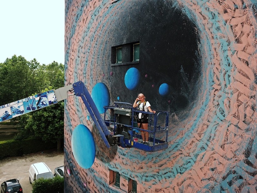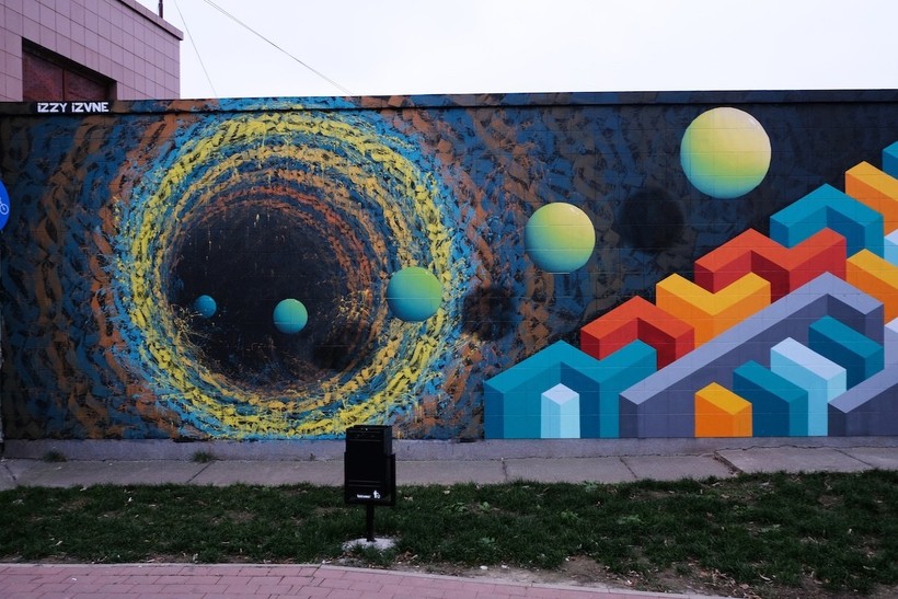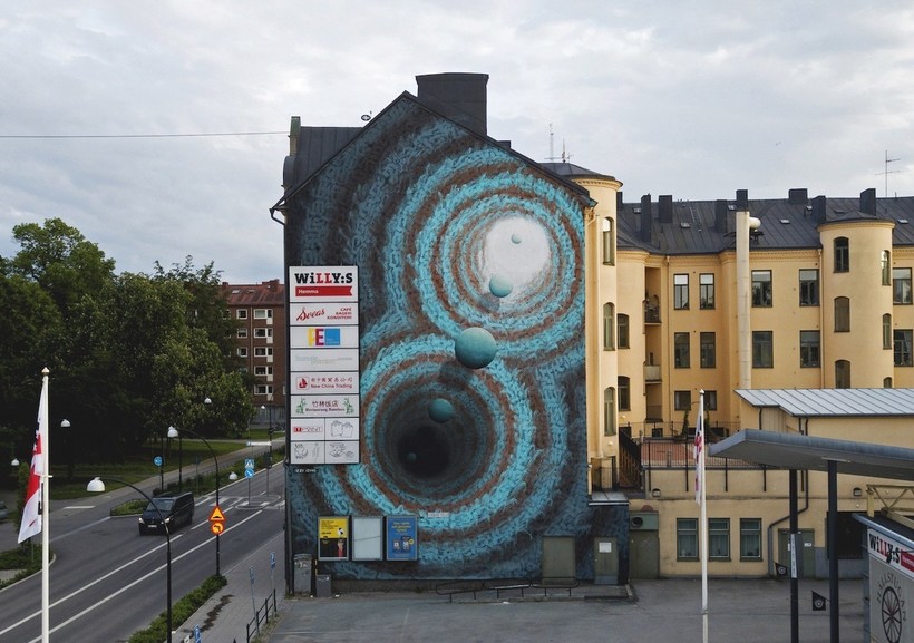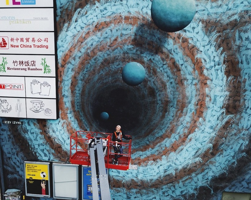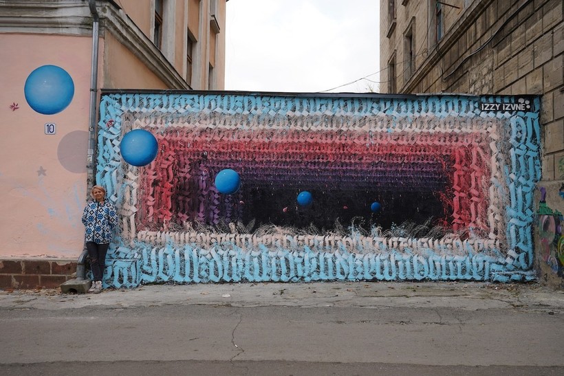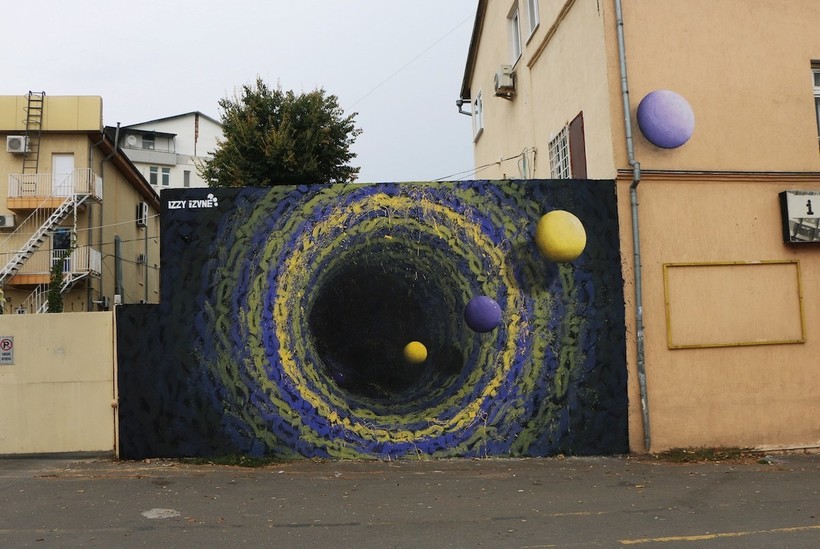 Задействовав в своем творчестве безграничную любовь к космосу, уличная художница Иззи Извне создала собственный уникальный стиль, благодаря которому сегодня ее узнают во всем мире. Молдавская художница сочетает каллиграфию с безупречно изображенными иллюзиями, добиваясь эффекта, будто стены втягивают нас в другую вселенную. Кажется, что ее рисунки открывают порталы в новое измерение, куда Извне любезно приглашает нас прогуляться вместе с ней.