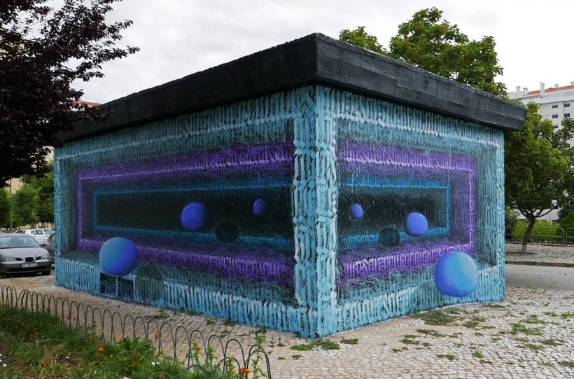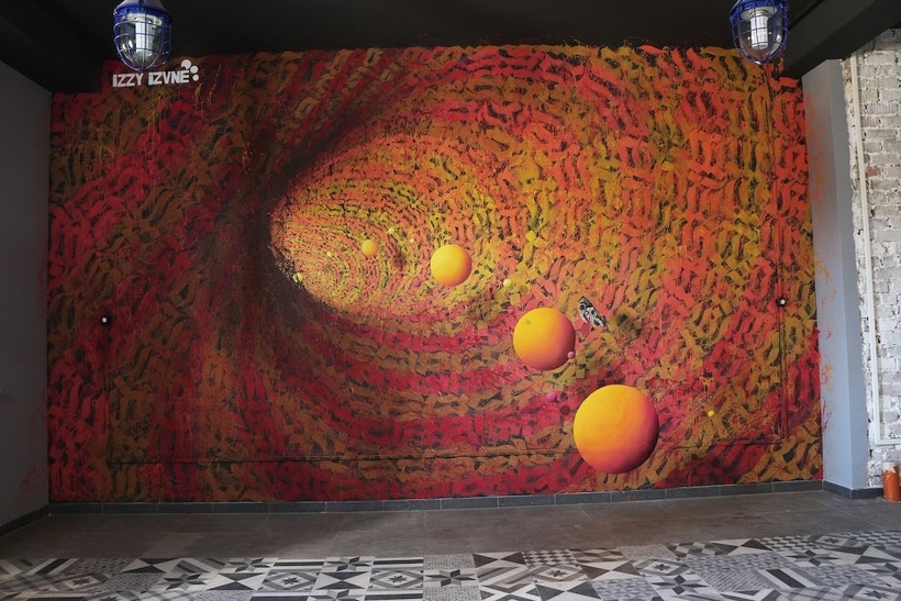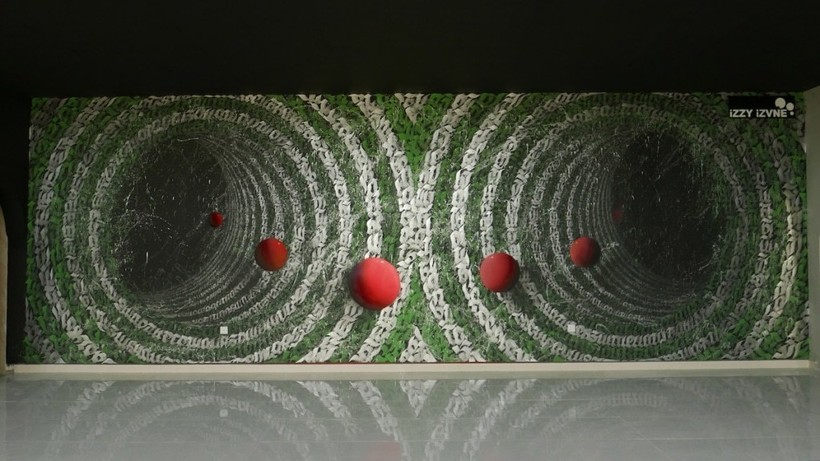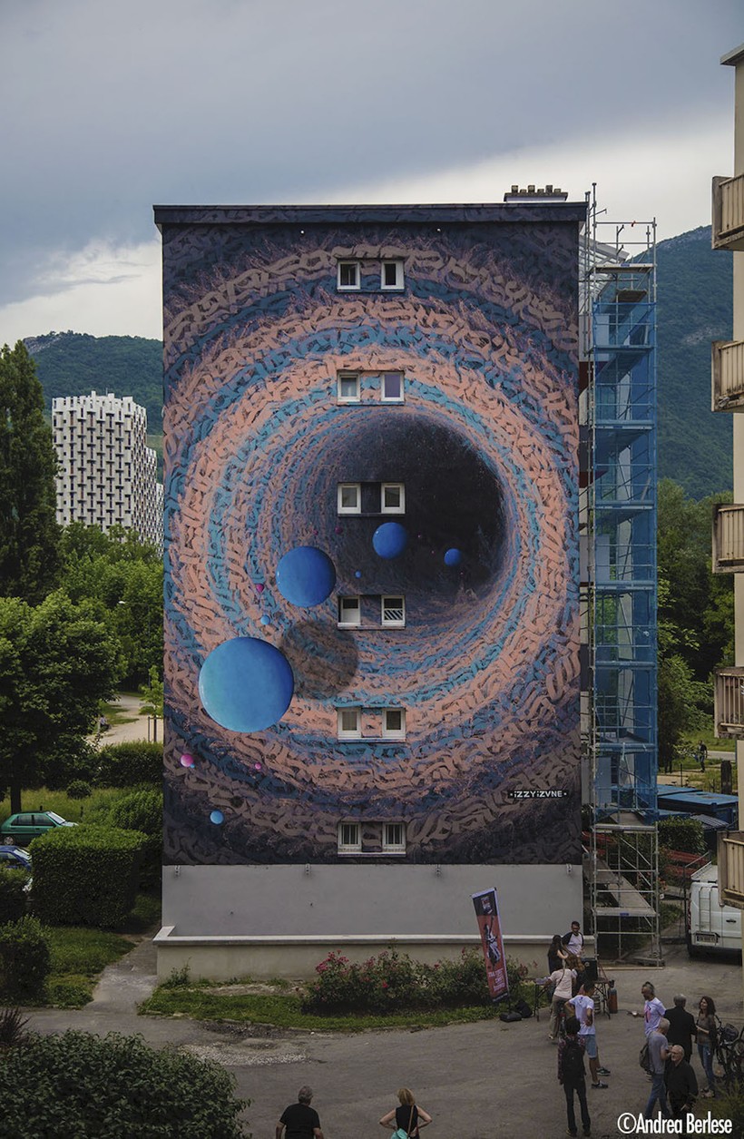 Иззи предлагает зрителям представить, что за серым цементом городской архитектуры открывается нечто большее — волшебный космический мир. Всматриваясь в глубокие расписные туннели, невозможно не поверить, что по ту сторону рисунка обитают невероятные существа в фантастическом измерении. Художница наполняет мир мощным искусством иллюзий и распространяет магию в городской среде.