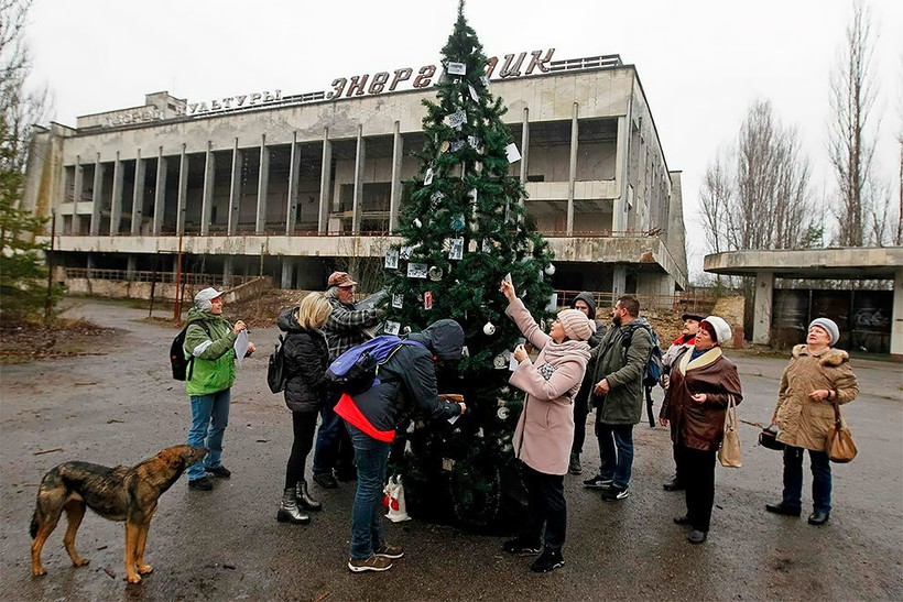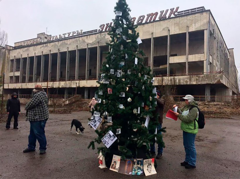 В мертвом городе Припять появилась новогодняя елка. Многие люди, некогда проживавшие в этом трагическом месте, решили присоединиться к небольшому празднику, организованному властями. Они с радостью украсили дерево, установленное рядом с дворцом культуры «Энергетик», развесив на нем старые фотографии детских лет и праздничные игрушки.