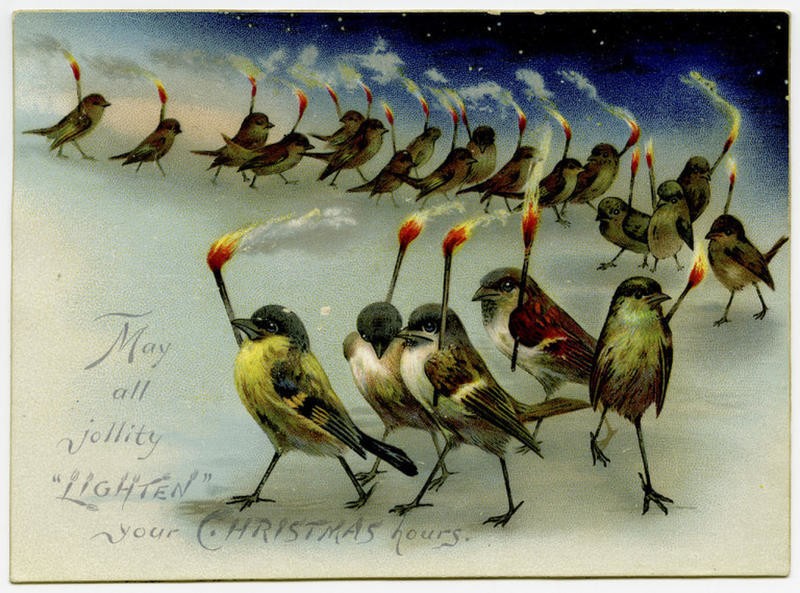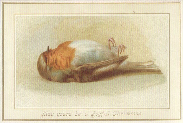 В 19 веке в Англии Рождество было не таким праздничным и веселым, как сегодня. Это было время, когда в викторианской культуре черный юмор играл важную роль. Это отражалось на сюжете и дизайне открыток. Некоторые из них имеют столь ужасающие образы, как похищенные дети, разрезающие друг друга лягушки, мертвые птицы. Одна из самых популярных викторианских открыток изображала мертвую малиновку. Рядом расположенная надпись гласила: «Пусть ваше Рождество будет более счастливым!».