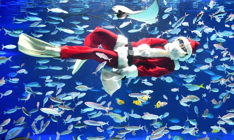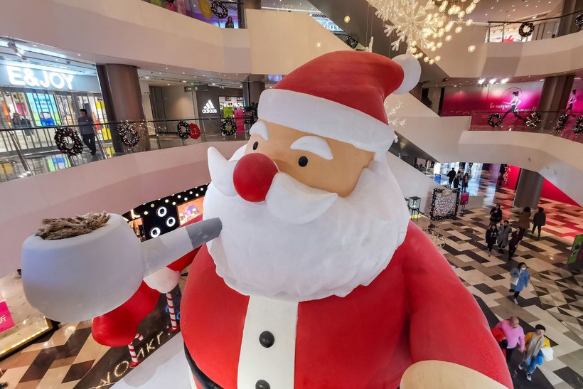 В Шанхае гигантские Деды Морозы с трубками встречают посетителей в центральных залах одного из здешних магазинов.