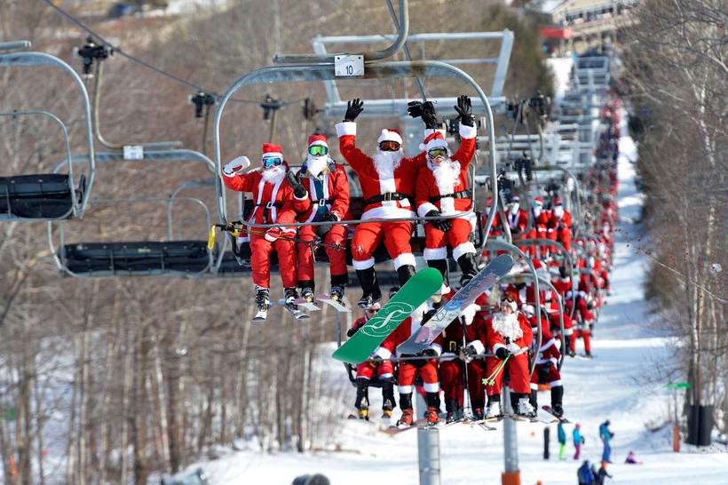 Целые группы сказочных Санта-Клаусов катаются на подъемниках горнолыжного курорта в штате Мэн, что в северо- восточной части США.