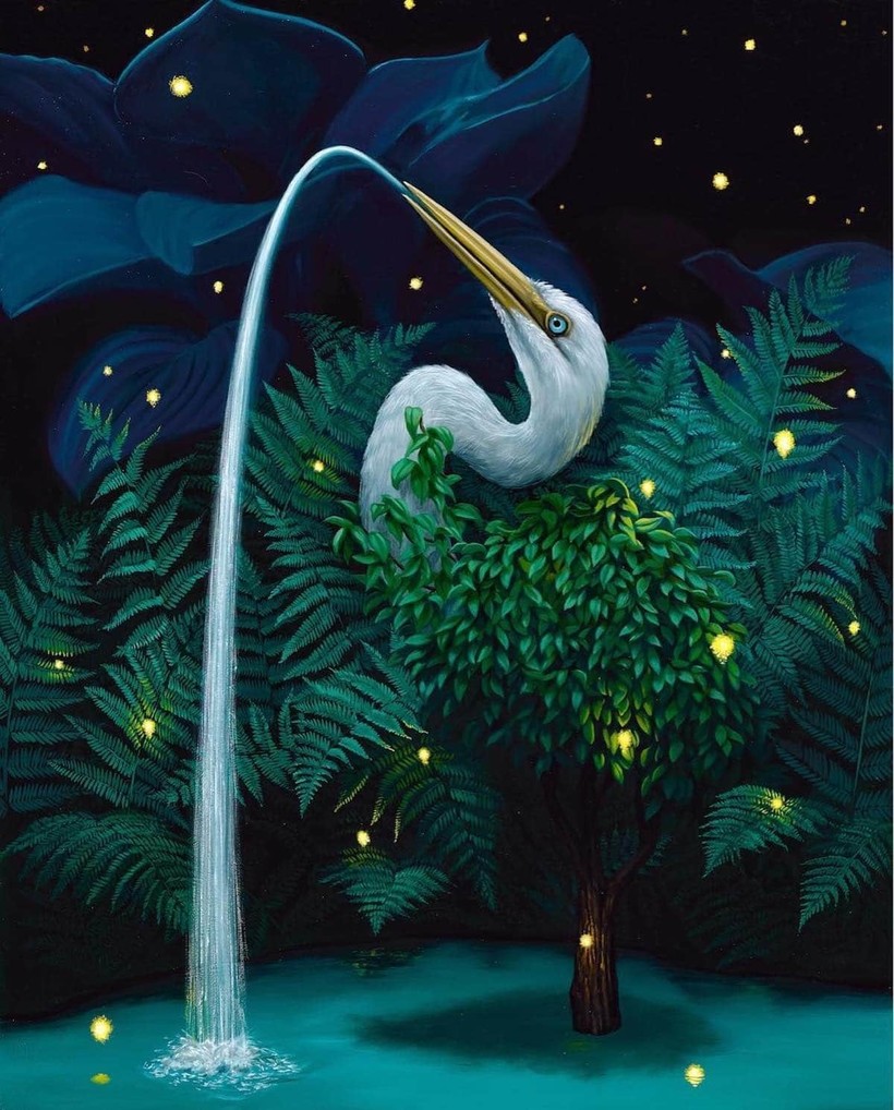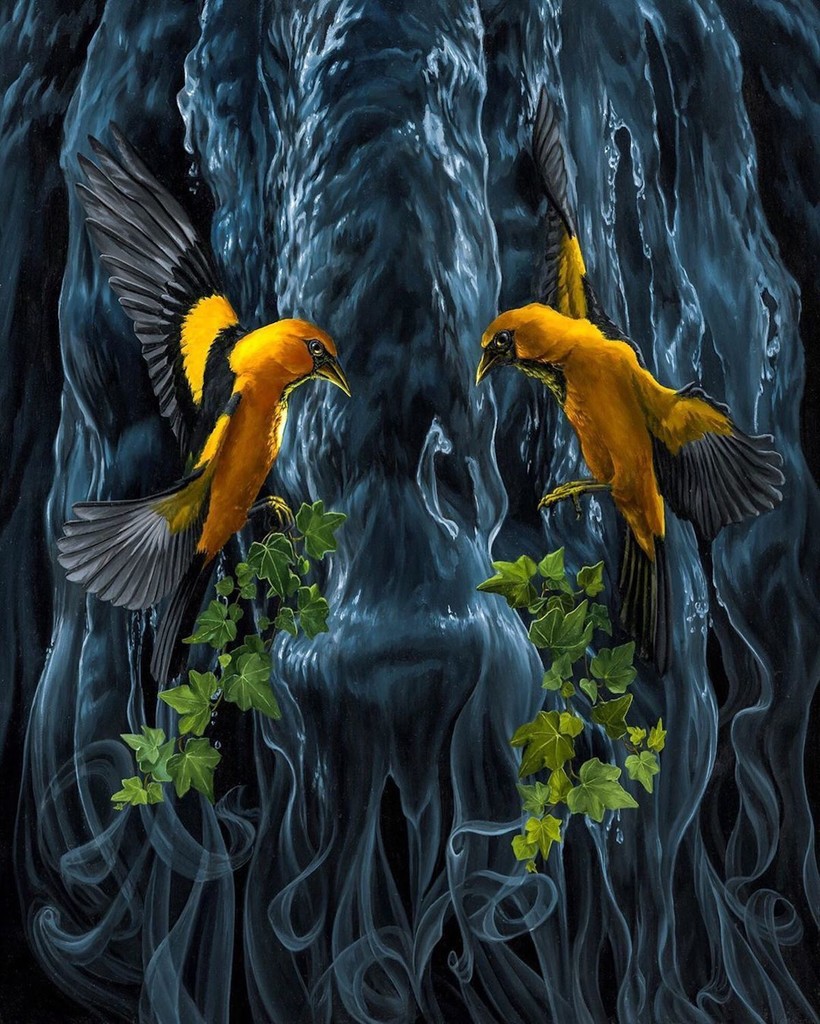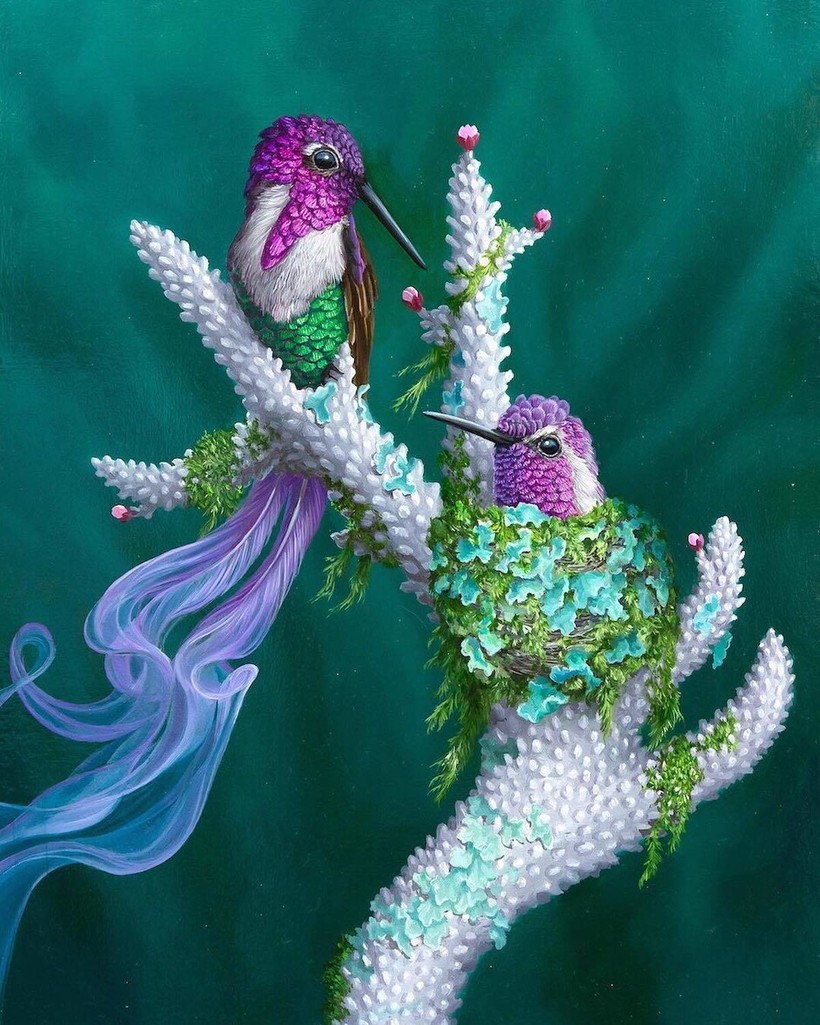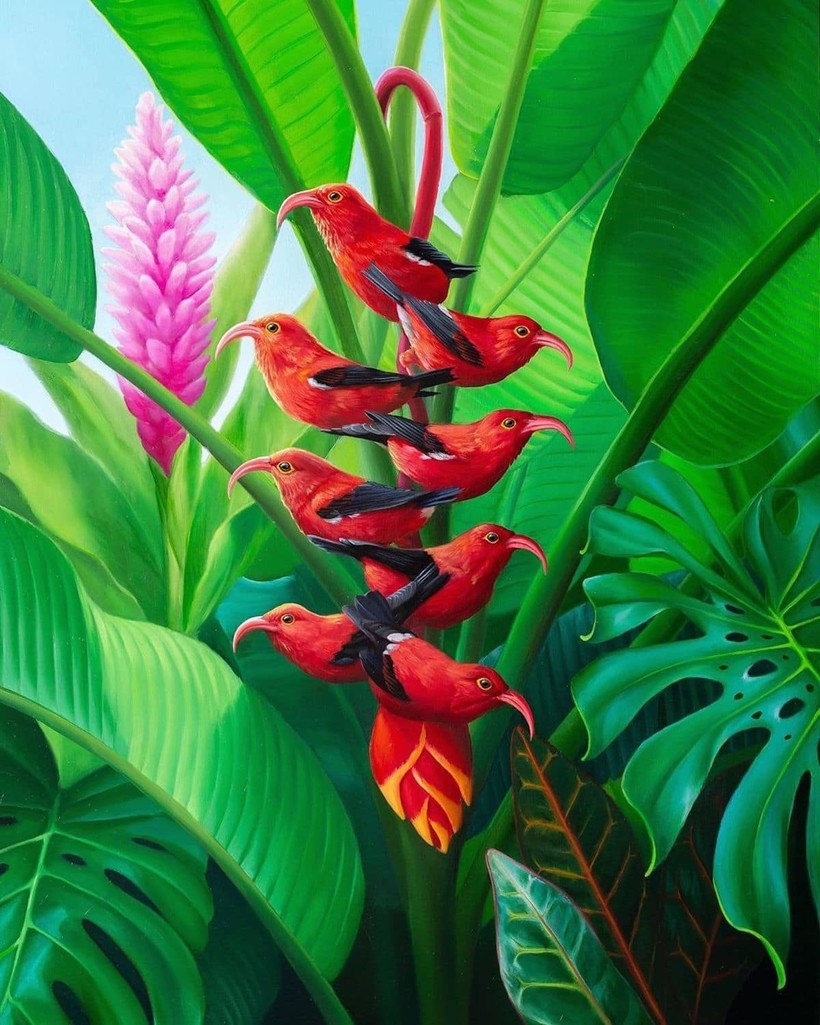 Художник Джон Чинг загипнотизирован прекрасным оперением птиц. В своих магических работах он воспевает их невероятные особенности и цвета, объединяя крылатых с другими элементами дикой природы, а иногда и с другими животными. Порой на его рисунках маленькие красные птички заменяют собой цветы на тропических растениях. Другая иллюстрация изображает потрясающую, величественную птицу бирюзового цвета, чьи перья превращаются в листья, перемежающиеся с желтыми цветами. Все это изящные примеры того, как довольно традиционный объект искусства, птицу, можно преобразовывать в нечто совершенно новое.