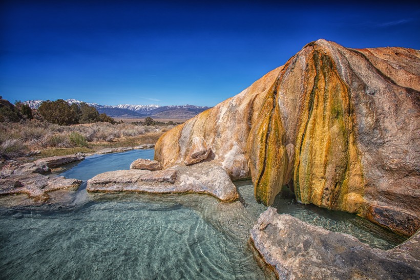 Травертин что в Калифорнии является потрясающим для запечатления пейзажей и здесь находятся теплые минеральные воды для купания.