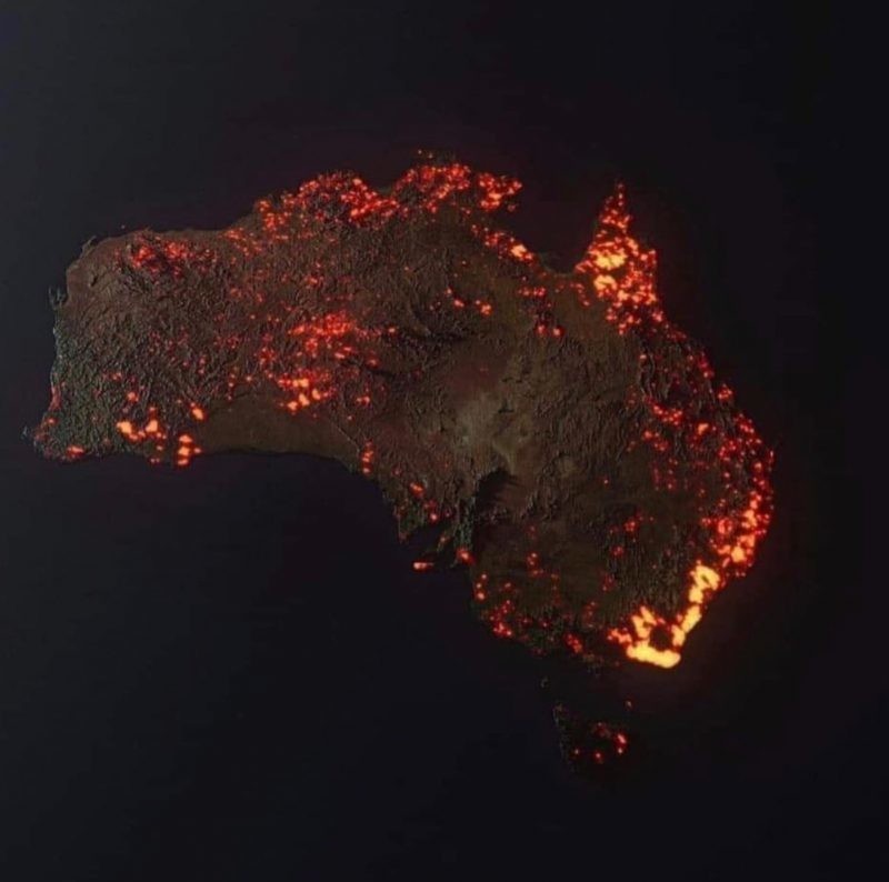 Коллаж, сделанный пользователями сети, которые собрали воедино все спутниковые снимки пожаров, охвативших Австралию за последние три месяца. Часть из них локализована.
