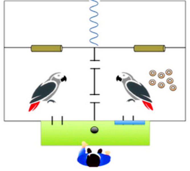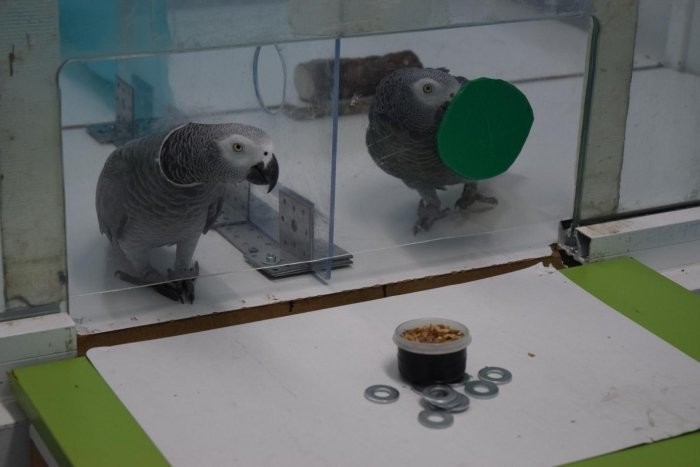 Суть эксперимента состояла в следующем. Серых попугаев, или жако, научили обменивать жетоны на вкусную еду, а затем поместили в специальный бокс, разделив двух птиц прозрачной перегородкой с отверстием для обмена. При этом у одной птицы были жетоны, но не было возможности обменять их на угощение. Вторая птица, наоборот, имела связь с инструктором, у которого была еда, но не имела при себе жетонов для обмена.