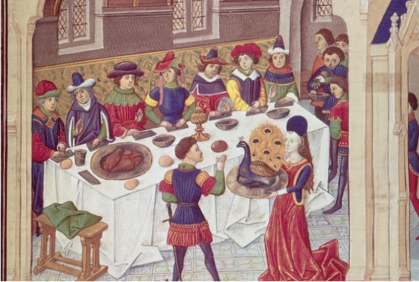 Основная трапеза средневековых монархов приходилась на полдень. Еда, присутствовавшая на королевском столе, включала в себя свежую дичь —дикого кабана, голубей и оленину — с королевских охотничьих угодий. Средневековые монархи любили еду, щедро сдобренную дорогими специями. Такая роскошь была недоступна большинству подданных .