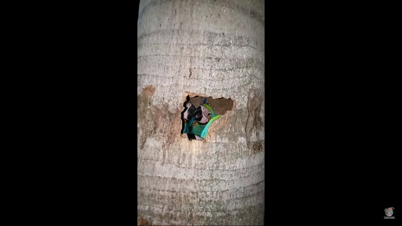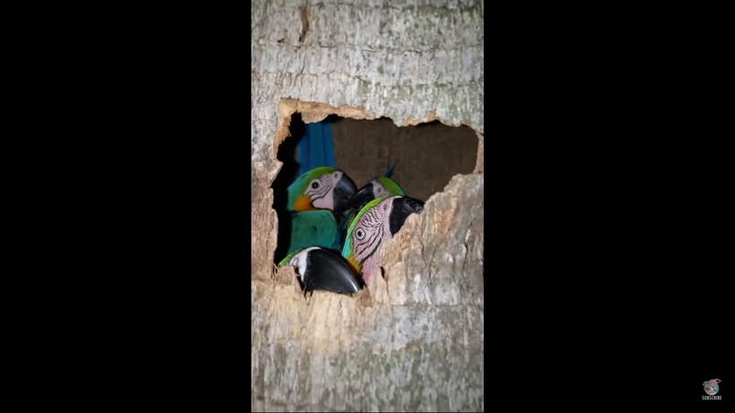 Эти пернатые часто селятся в дуплах деревьев, однако автор видео, представленного ниже, один из жителей Бразилии, во время своей вечерней прогулки обнаружил дерево, внутри которого обосновалась целая семья попугаев. Внимание бразильца привлекли птицы, которые летали вокруг засохшего ствола. Кевин Жан Отилио Родригес приблизился к жилищу ара и снял их на свой телефон. Вот только попугаям не понравилось любопытство человека, и они начали угрожать ему громкими криками. Теснота совершенно не смущала веселое семейство, комфорт для них явно не главное.