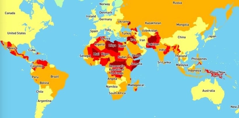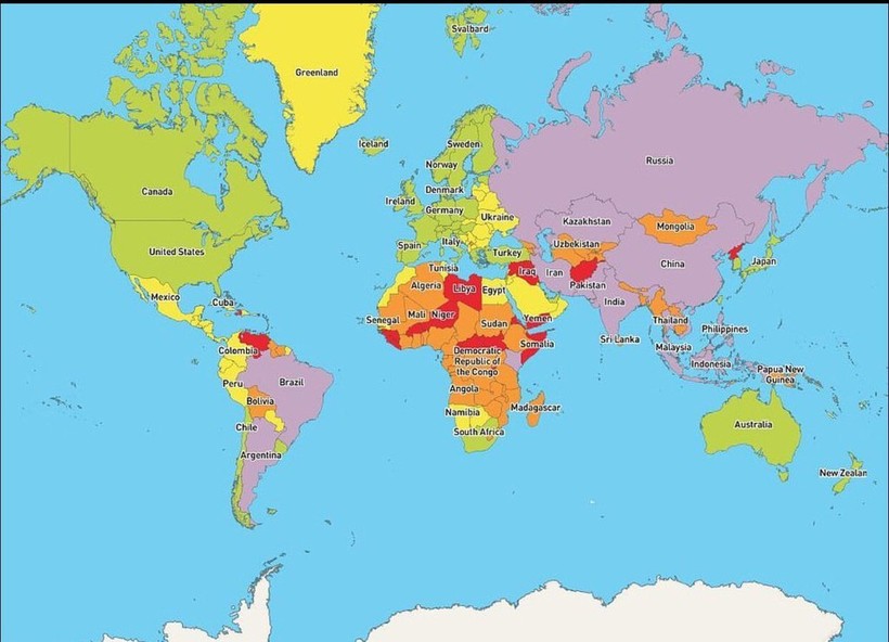 Каждое место на Travel Risk Map отмечено различной цветовой гаммой по нарастанию опасности: от зеленого оттенка и незначительного уровня угрозы до бордового цвета, обозначающего наивысший риск. Таким образом, если взглянуть на карту, получится, что самыми безобидными для туристических маршрутов странами специалисты считают Гренландию, Исландию, Норвегию. Следующими в перечень попали Канада, США, Италия, Германия, Аргентина, Китай, Австралия и другие. Опасными точками нашей планеты в данный момент считаются Ливия и Сомали. Афганистан и Венесуэла помечены критическим уровнем опасности. Россия получила оранжевый цвет, то есть средний уровень опасности.