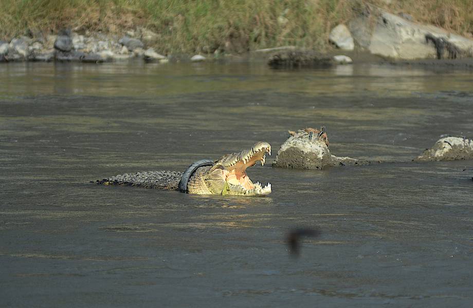 В 2016 году в водах реки Палу жители Сулавеси заметили огромного четырехметрового крокодила. На шее рептилии была шина от скутера или мопеда. Не совсем понятно, как животное попало в капкан, но одно ясно точно — если не лишить крокодила обузы, то однажды он просто может задохнуться. Усугубляет дело тот факт, что крокодил, несмотря на свой большой размер, всего лишь подросток и продолжает увеличиваться в размерах. Рептилия часто лежит с открытым ртом, словно ей не хватает воздуха.