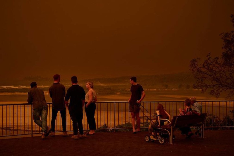 Люди смотрят на морской пляж, покрытый густым дымом. Теросс Хед, Австралия. Январь, 2020 г.