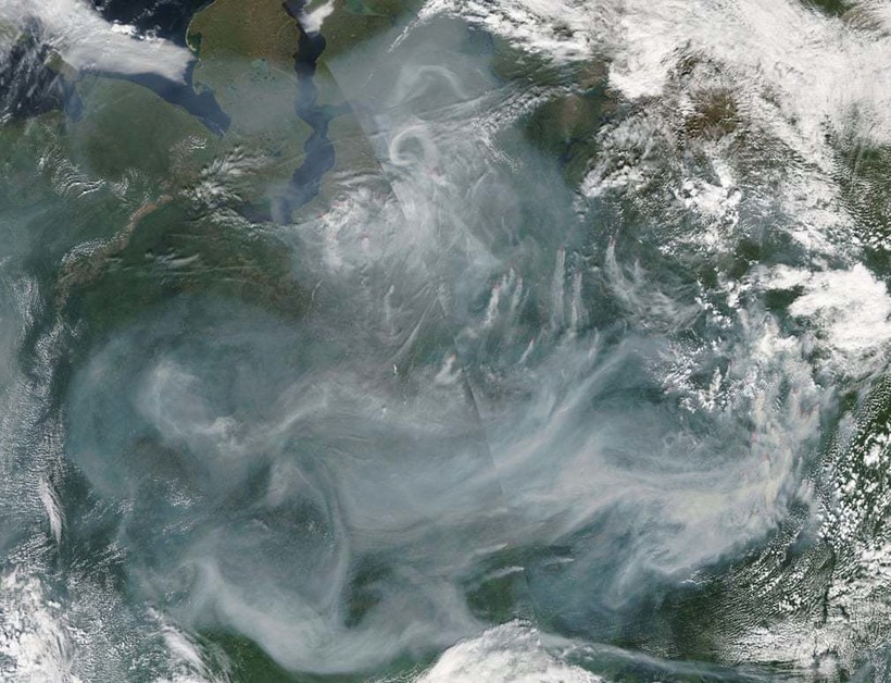 Дым от пожаров на спутниковых снимках в северной и центральной частях России. Тундра невероятно чувствительна к изменению климата: из-за повышения температуры очень быстро высыхает торф. Фактически он становится топливом для лесных пожаров. Самое ужасное, что это замкнутый круг: горящие торфяники выбрасывают огромное количество углекислого газа и метана, способствуя глобальному потеплению. Июль, 2016 г.