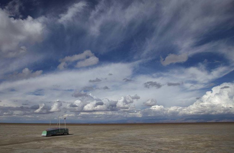 Заброшенный катер лежит на дне пересохшего озера Поопо, которое исчезло четыре года назад. Боливия, январь, 2016 г.