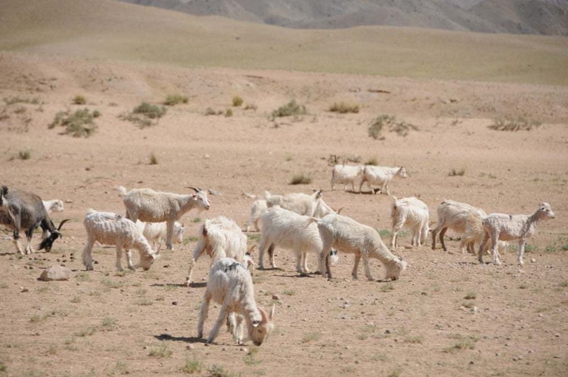 Козы пытаются найти траву на мертвом от засухи пастбище. Внутренняя Монголия, КНР. Июнь, 2015 г.