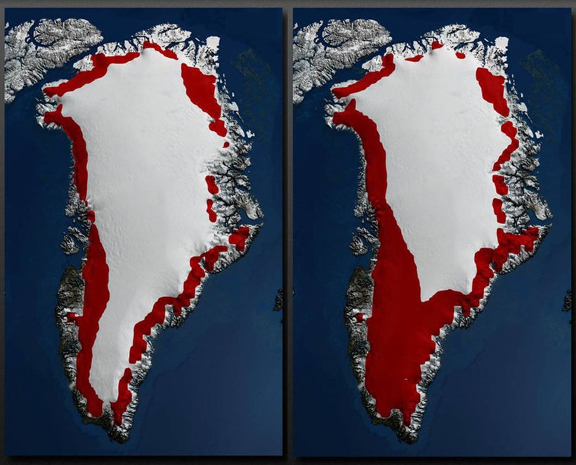 Аномальная летняя жара привела к тому, что лед на этом северном острове минувшим летом таял в 7 раз быстрее, что привело к беспрецедентному результату — растаяло около 90 % всего гренландского льда. И если площадь ледников уменьшается с каждым годом, что уже не удивляет ученых, то толщина большинства ледников стала катастрофически сокращаться за последние годы.