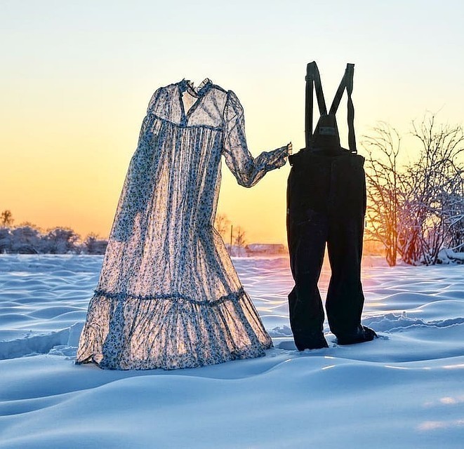 Дело было на святки, как раз тогда, когда по старым традициям гадают на суженого. Поэтому к праздничному платью подобрали «жениха». Им стали мужские штаны с подтяжками. Платье замерзло очень быстро, штаны тоже не заставили себя долго ждать.