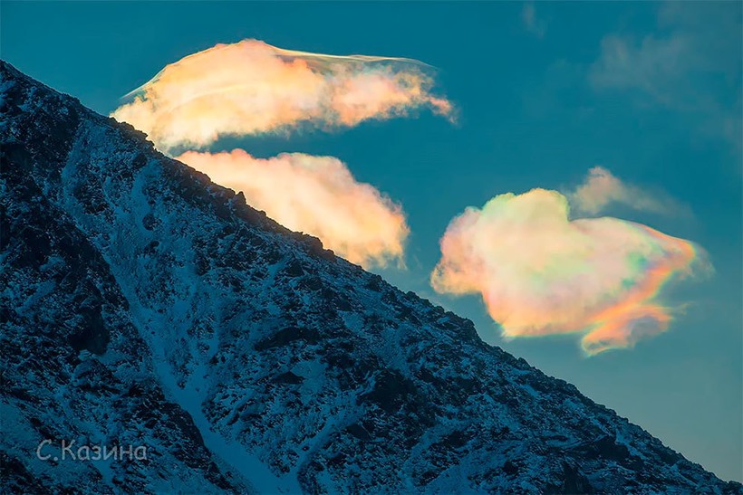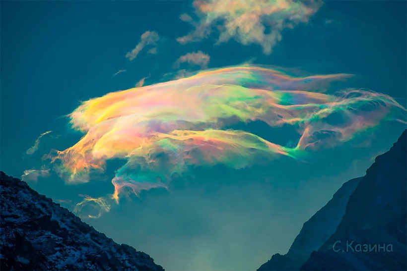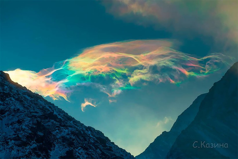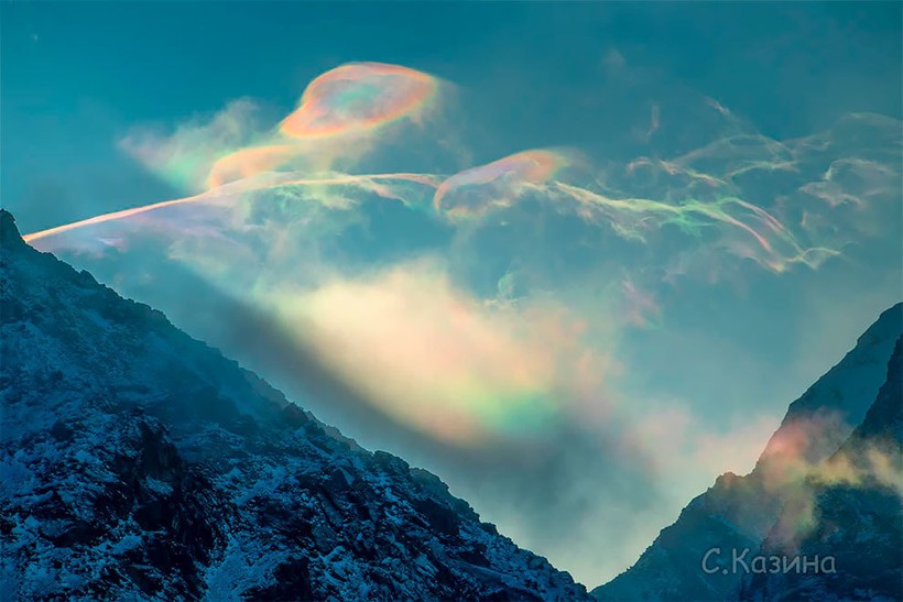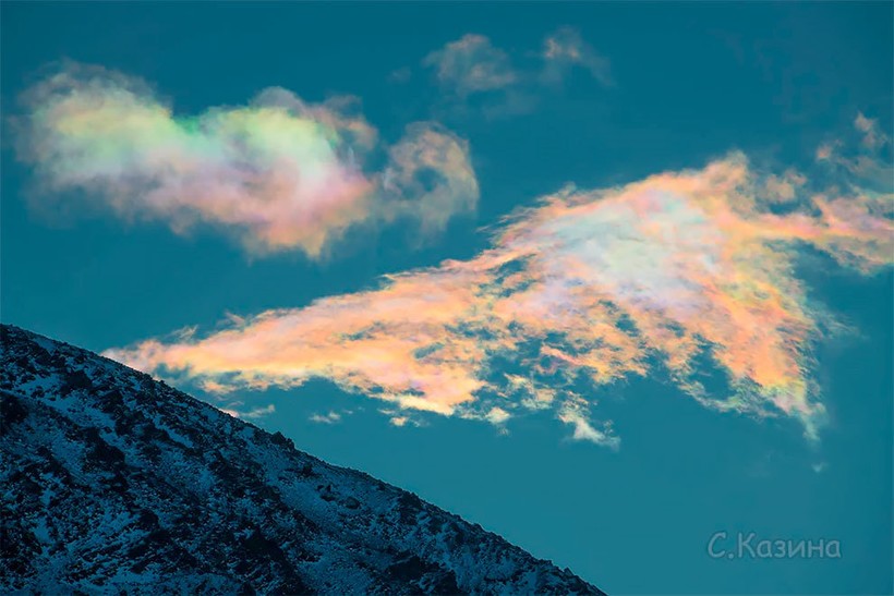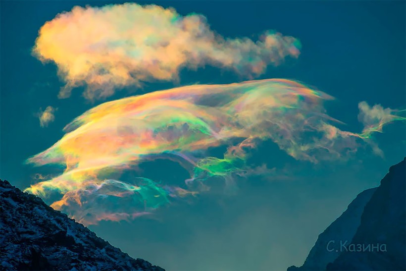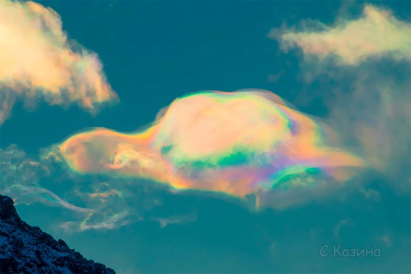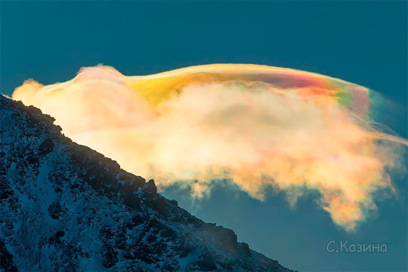 Радужное облако, или иризация — это красочное, незабываемое зрелище, удивительный процесс, который происходит в облаке и становится видимым, когда оно находится совсем рядом с солнцем или луной. Своими оттенками это явление напоминает мыльные пузыри или разводы масла на поверхности воды. Казина говорит, что в день съемки был мощнейший ветер, постоянно трансформирующий форму облачных образований, а иногда они становились такими тонкими, что больше походили на кружева.