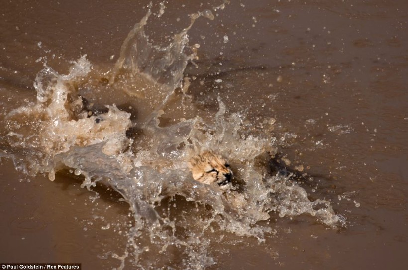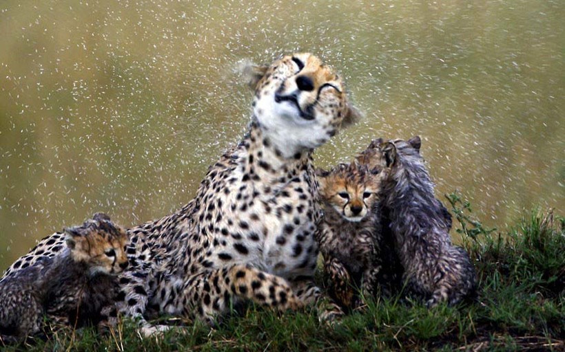 Недавно ставшая мамой самка гепарда стряхивает с себя капли дождя
