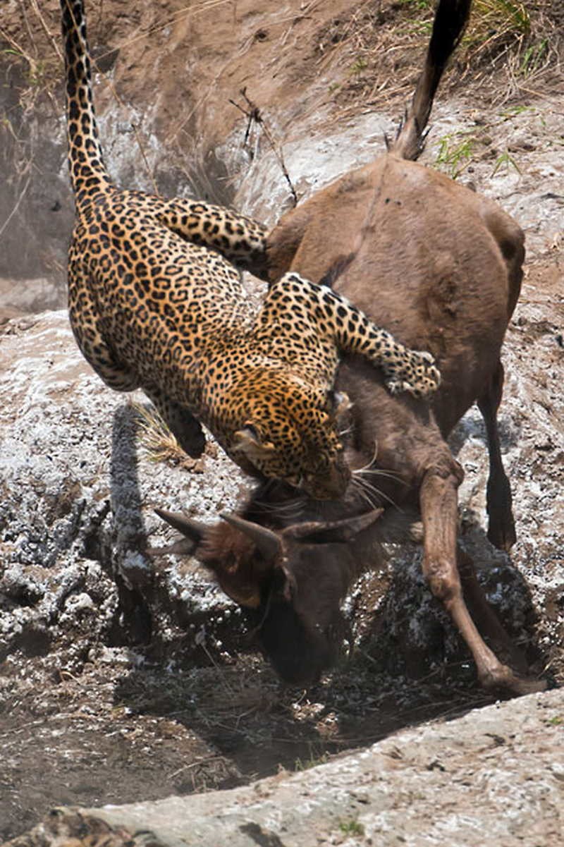 Леопард набросился на антилопу и пытается прокусить ей шею