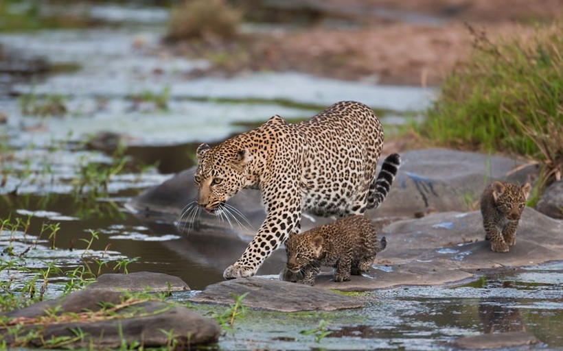 Самка леопарда и ее детеныши осторожно переходят через воду (Масаи-Мара)