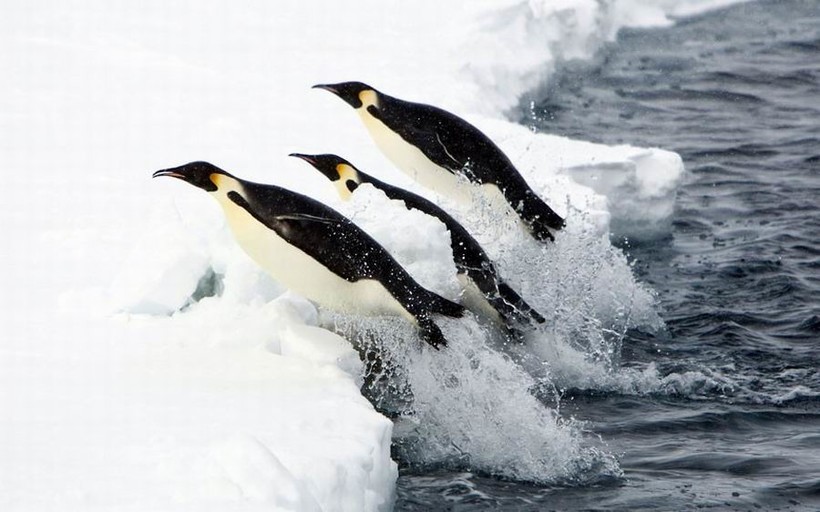 Троица пингвинов, синхронно выпрыгивающих из воды (Антарктида)