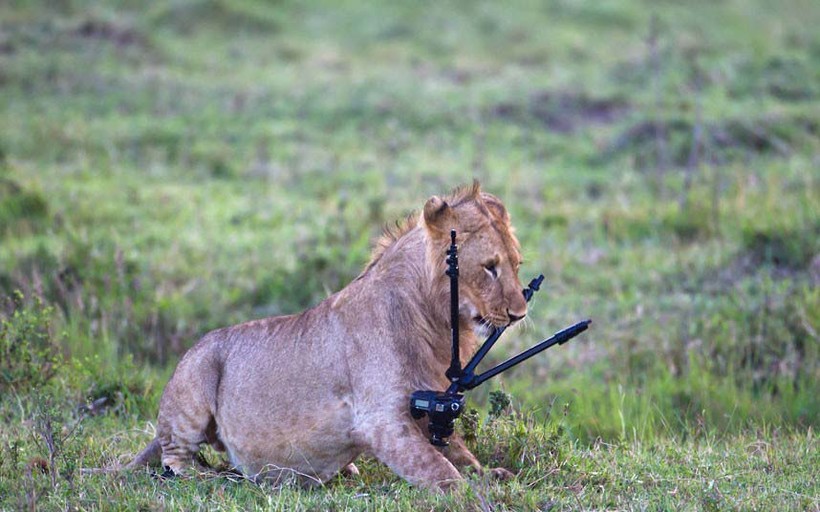 Лев, обнаруживший оставленный во время сафари фотоаппарат (Масаи-Мара)